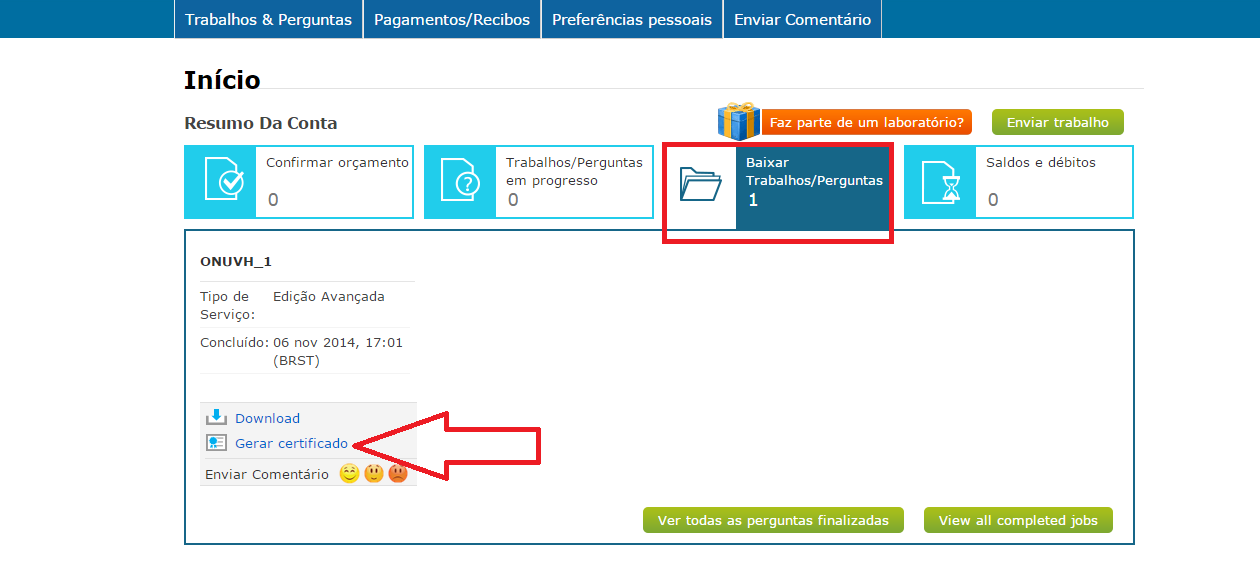 2. Para gerar o certificado, certifique-se de estar em sua conta EditageOnline (veja a imagem abaixo) e clique em “Baixar trabalhos/ perguntas conforme destacado em vermelho